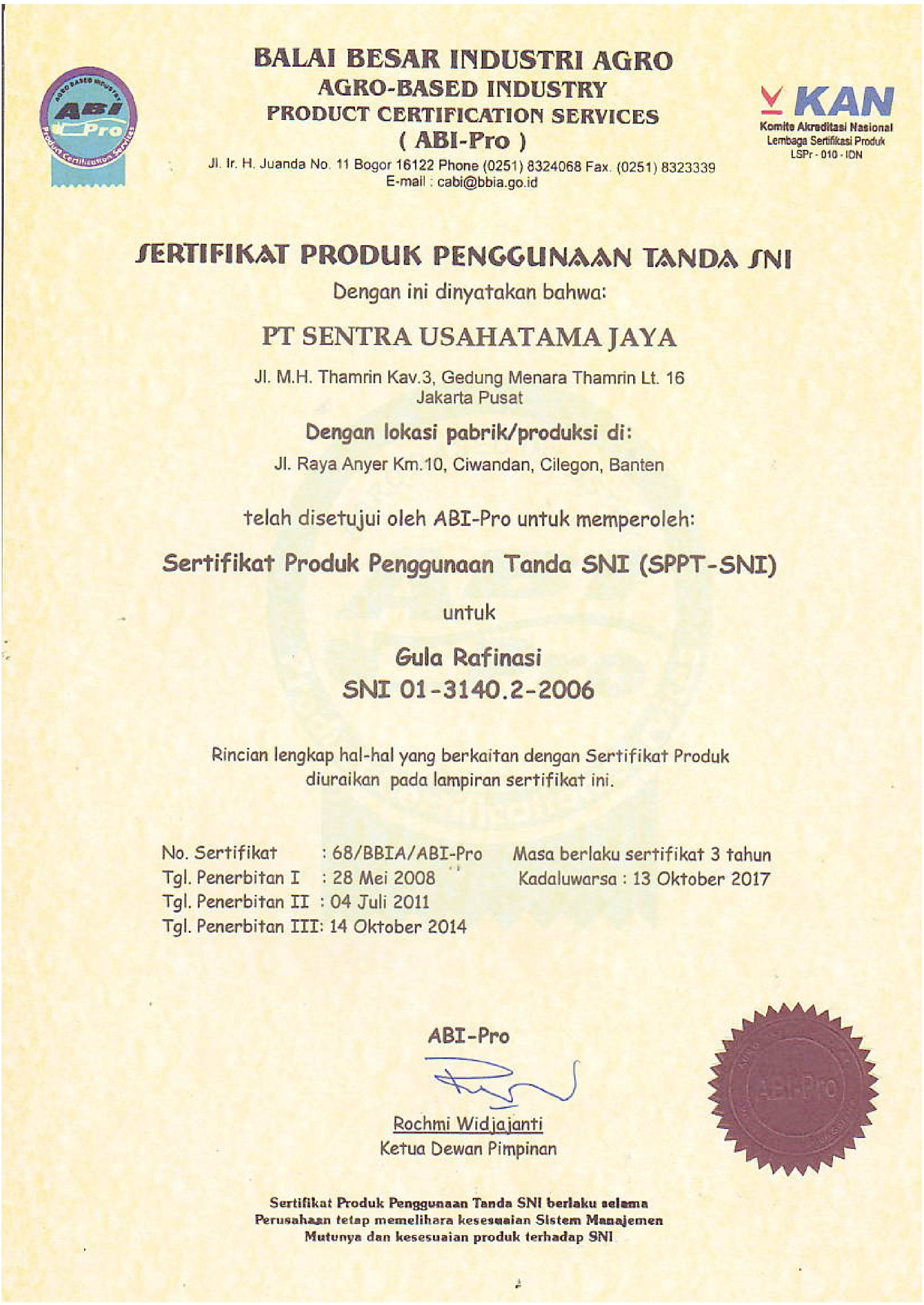 | Pencapaian gemilang SUJ dalam industri kilang gula melalui perolehan Sertifikat SNI yang dikeluarkan oleh Agro-Based Industry Product Certification Services (ABI-Pro). |